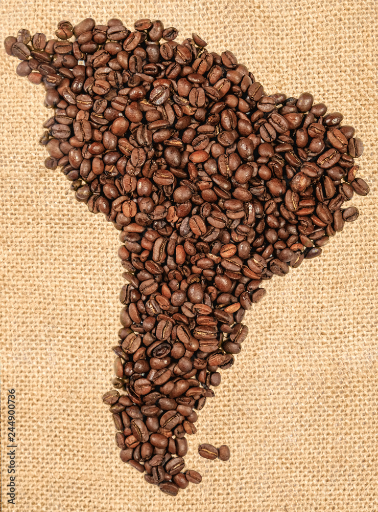 Whole bean coffee. The contour of the mainland of South America is made of coffee beans on jute burlap.