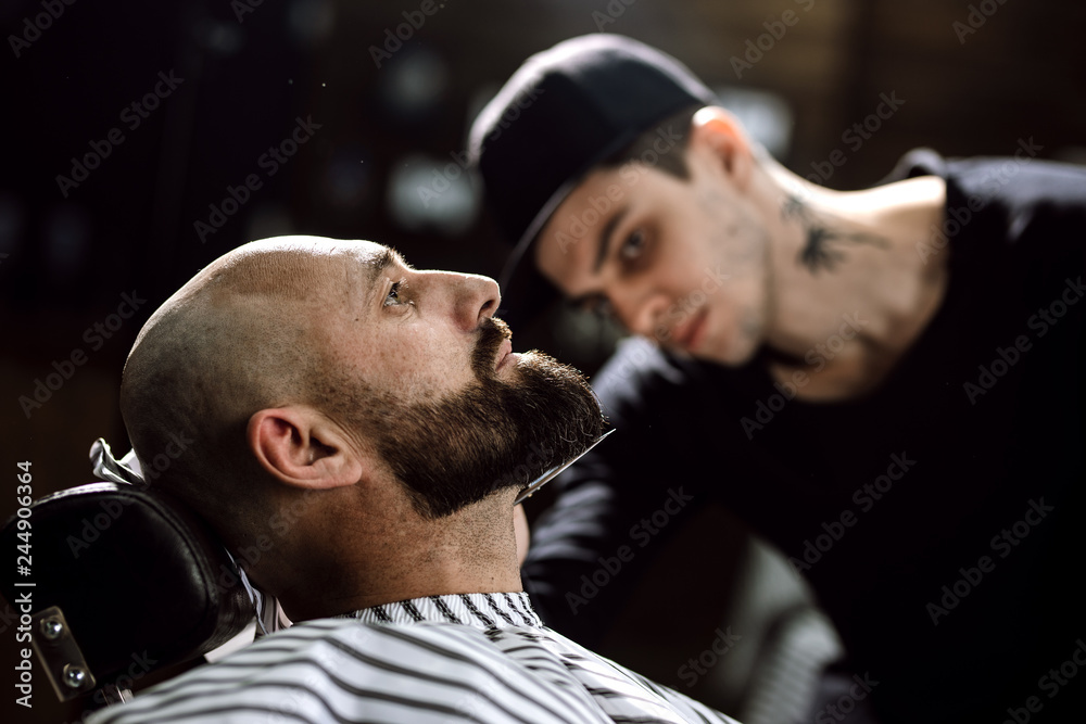 The barber dressed in a black clothes scissors beard of brutal man in the stylish barbershop