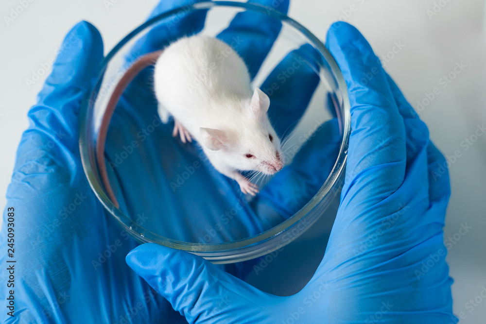 Scientist holding white laboratory mouse (mus musculus) in gloved hands