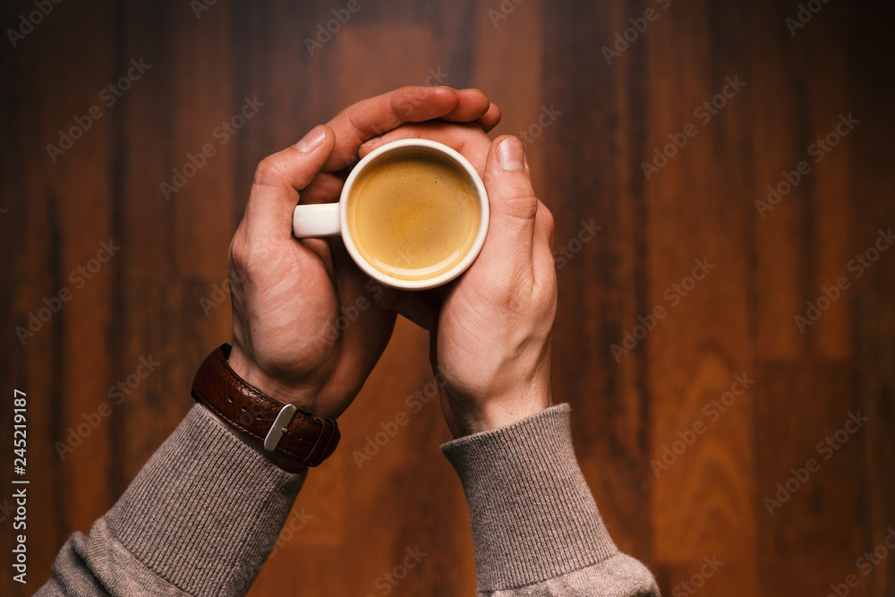 Man holding a cup of coffee on a wooden, vintage background. Hand of young businessman holding a mug of coffee. Vintage tones.