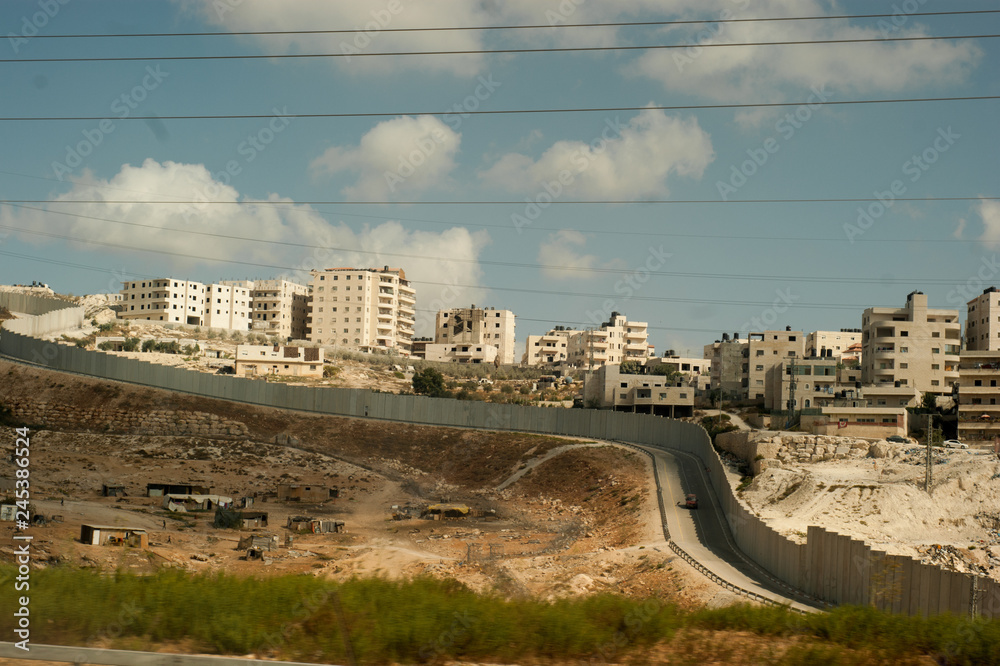 Small village and palestinian town on the hill behind separation wall on the West Bank in Israel.
