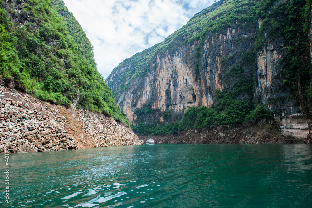 Spring summer diet salad with strawberries, cucumber, green field salad and yogurt mint sauce served in blue plate with cloth napkin over grey texture background. Top view, copy space