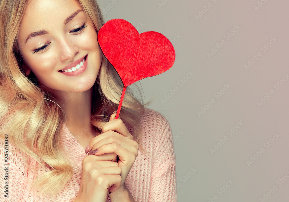 beautiful happy smiling young woman who is holding a big red heart for valentine`s day . Valentine model girl portrait.