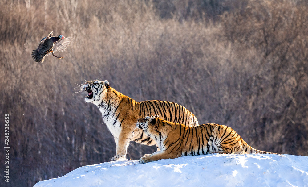 Two Siberian(Amur) tigers stand on a snow-covered hill and catch prey. China. Harbin. Mudanjiang province. Hengdaohezi park. Siberian Tiger Park. Winter. Hard frost. (Panthera tgris altaica)