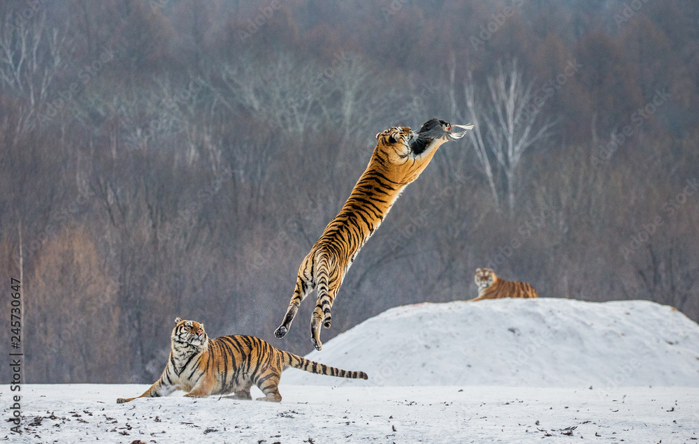 Siberian tiger in a jump catches its prey. Very dynamic shot. China. Harbin. Mudanjiang province. Hengdaohezi park. Siberian Tiger Park. Winter. Hard frost. (Panthera tgris altaica)