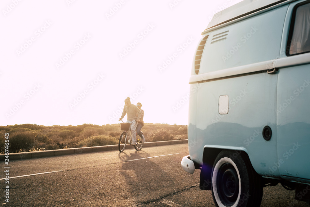 Nice happy crazy youthful concept couple enjoy riding together ona same bike like young - no limit age people play on the road with sunset in background and old vintage blue van parked - happiness