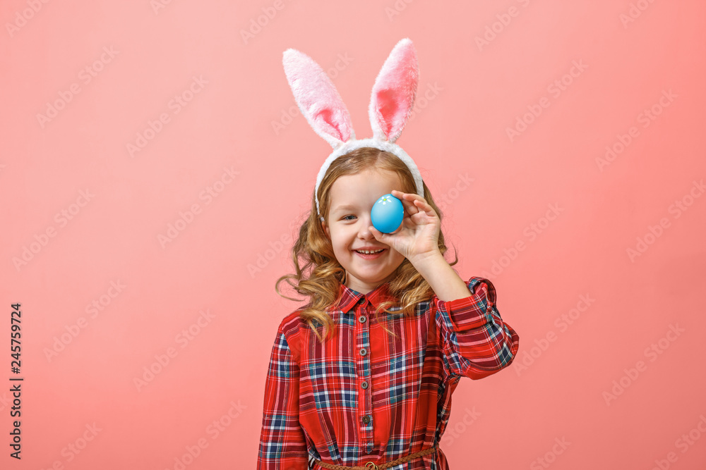 Cheerful little kid girl with bunny ears with an easter egg on a colored background.