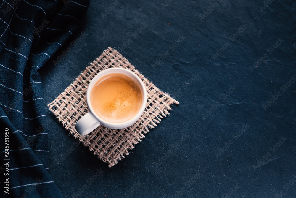 Cup of coffee in the middle of coffee beans with biscuits and tablecloth. Grained product. Hot drink. Close up. Harvesting. Natural background. Energy. Fresh espresso coffee