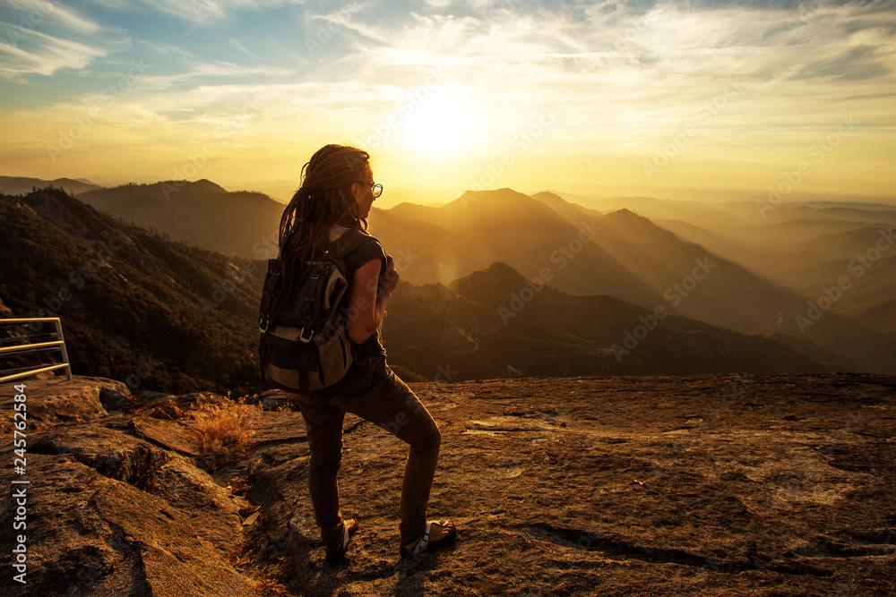 Hiker meets the sunset on the Moro rock in Sequoia national park, California, USA.