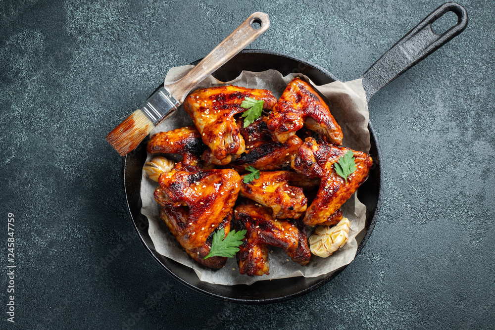 Baked chicken wings in barbecue sauce with sesame seeds and parsley in a cast iron pan on a dark concrete table. Top view