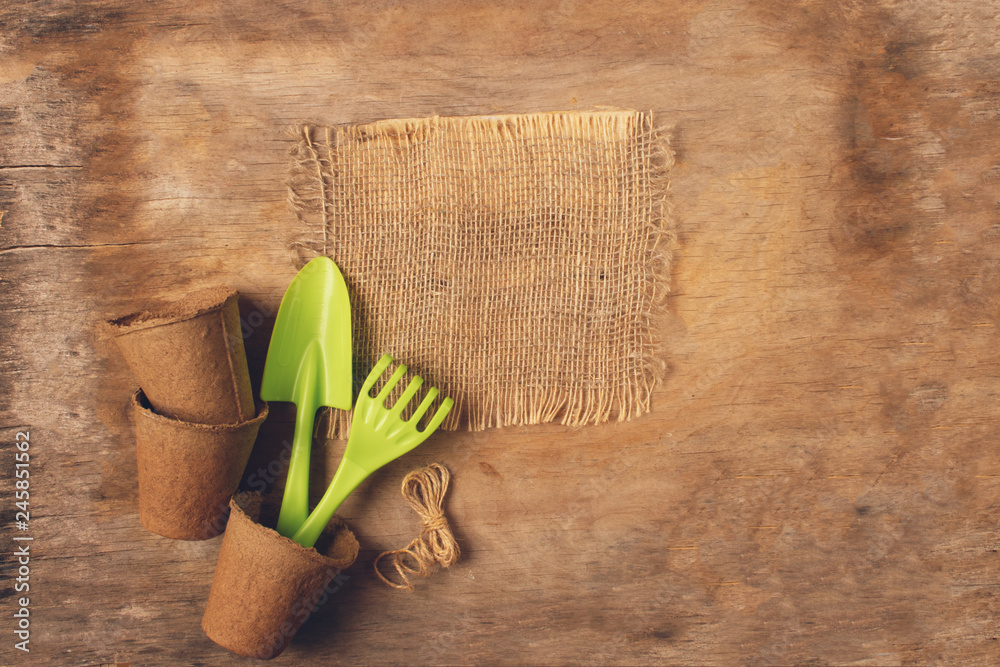 Preparing for spring to transplant plants. Pot, shovel dark wooden rustic background.