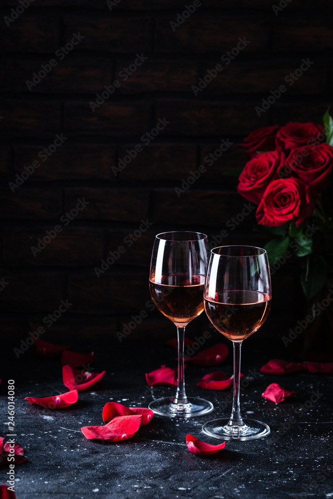 Two wine glasses of rose wine on brick background, bouquet of red roses for romantic evening for Valentines day surprise, marriage proposal passion and love celebration, copy space