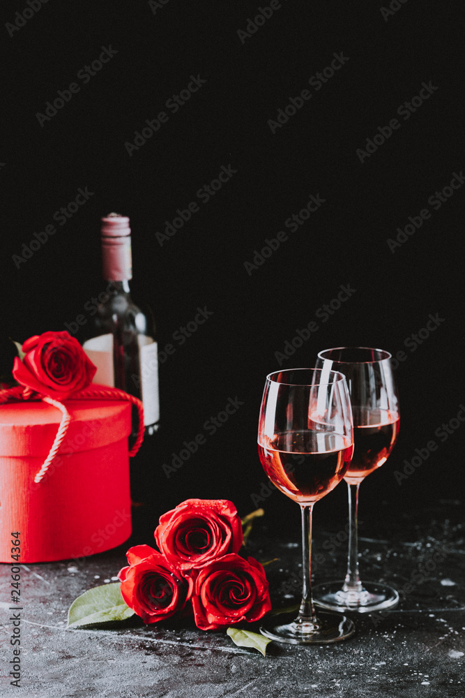 Two wine glasses of rose wine on brick background, bouquet of red roses for romantic evening for Valentines day surprise, marriage proposal passion and love celebration, copy space