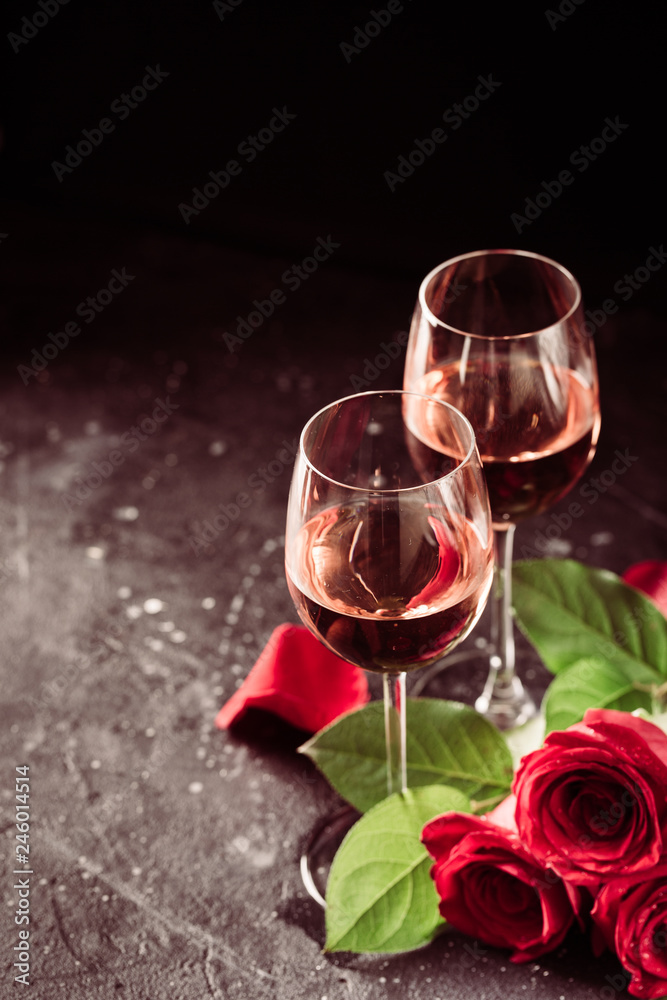 Two wine glasses of rose wine on brick background, bouquet of red roses for romantic evening for Valentines day surprise, marriage proposal passion and love celebration, copy space