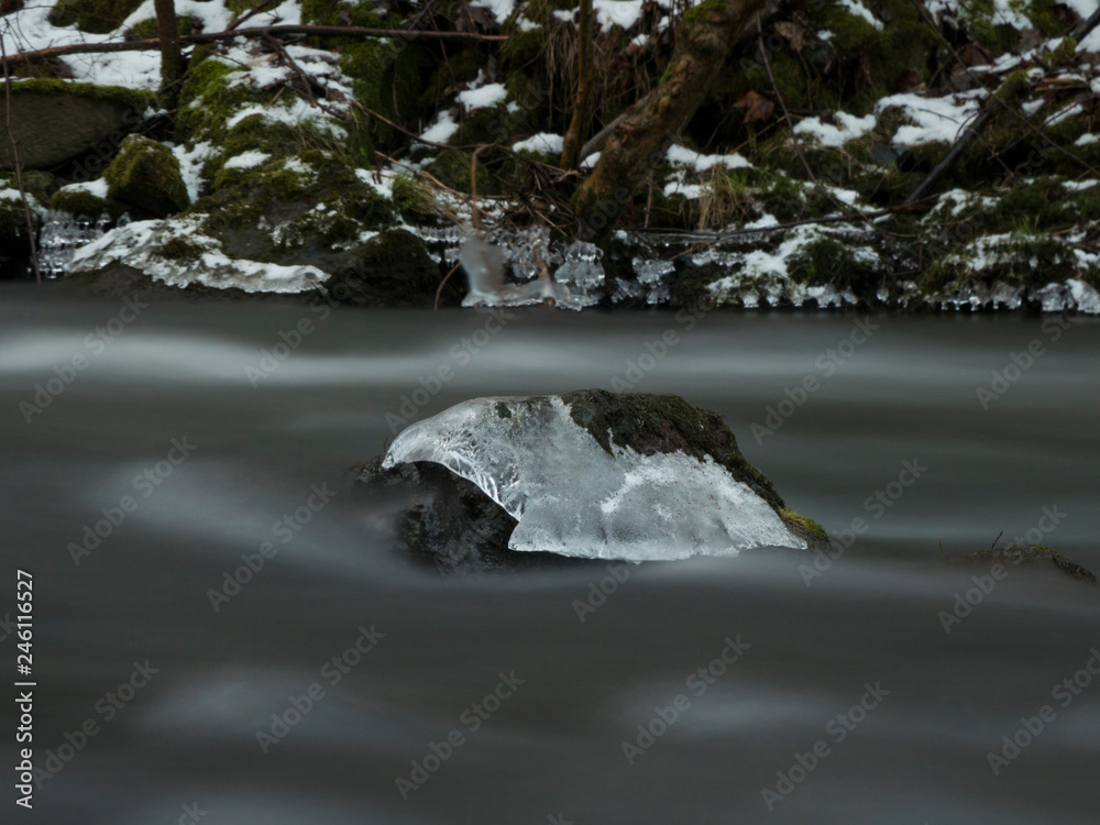 smooth motion of wild water in a river in winter with snow and ice on rocks and stones in the beautiful nature of a forest