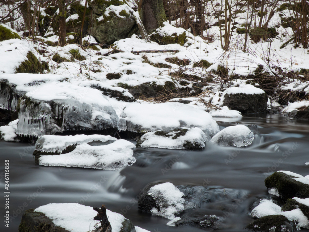smooth motion of wild water in a river in winter with snow and ice on rocks and stones in the beautiful nature of a forest