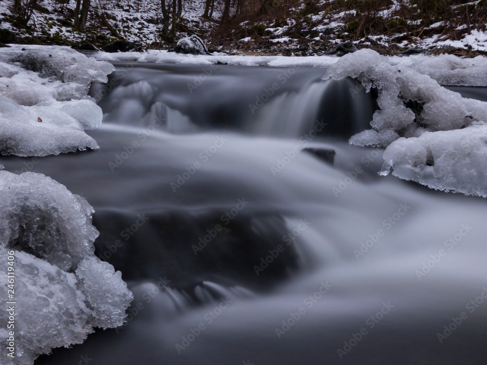 smooth motion of wild water in a river in winter with snow and ice on rocks and stones in the beautiful nature of a forest