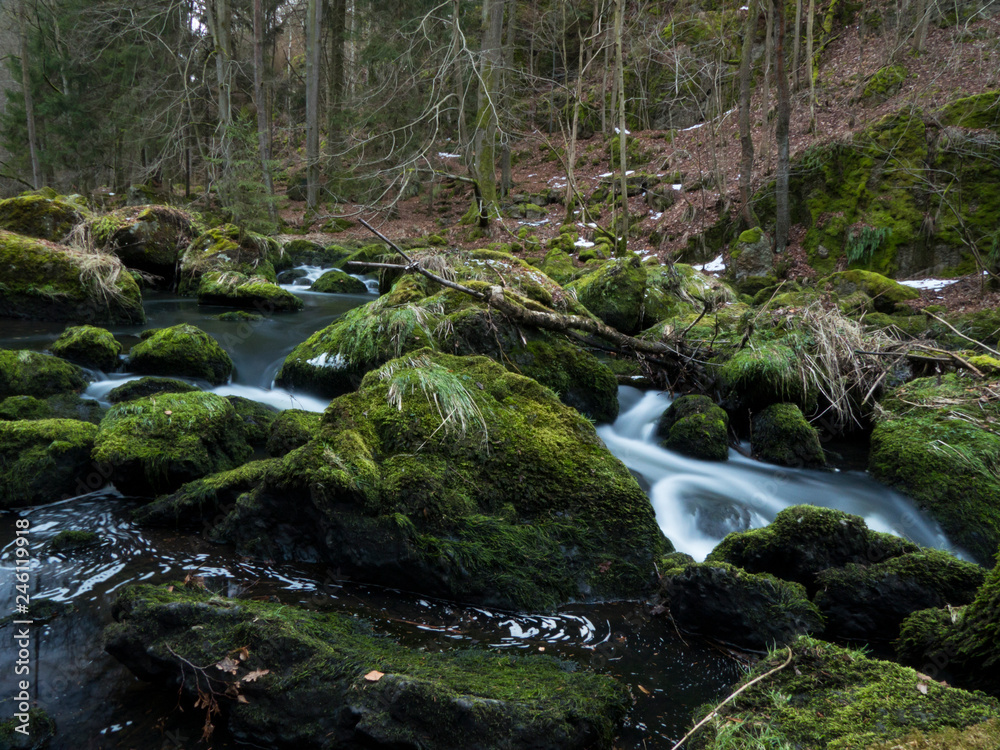 smooth motion of wild water in a river in winter with snow and ice on rocks and stones in the beautiful nature of a forest