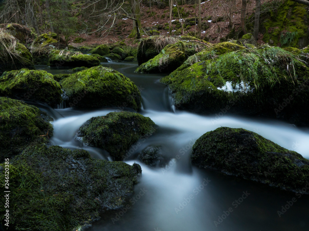 smooth motion of wild water in a river in winter with snow and ice on rocks and stones in the beautiful nature of a forest