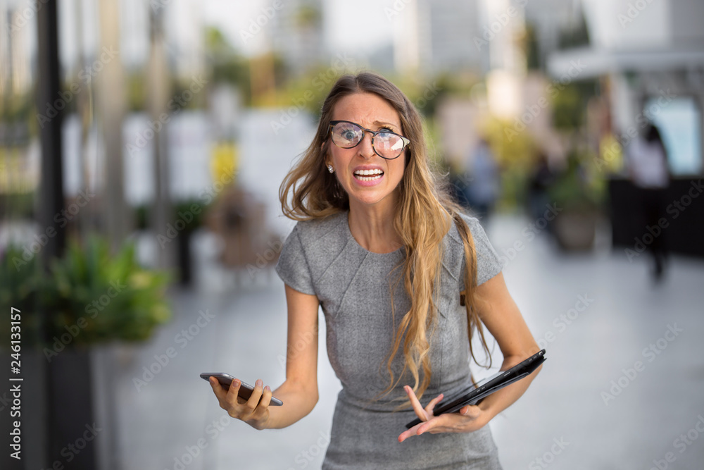 Business personal assistant, stressed and overwhelmed with bad cellphone reception
