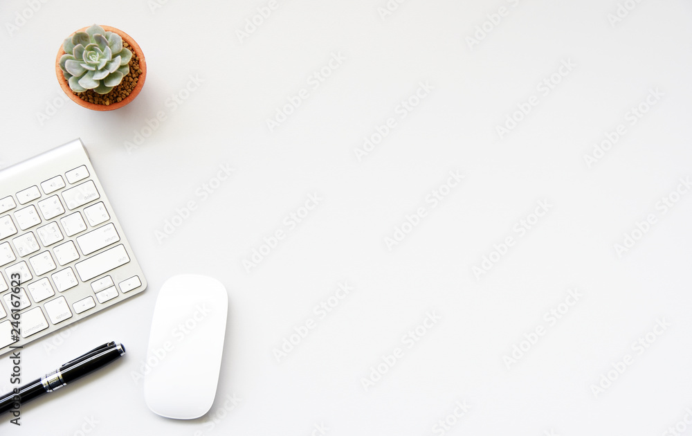 Working with keyboard and Succulent copy space on White table background.Top view,Flat lay,style Minmal workspace,business Concept