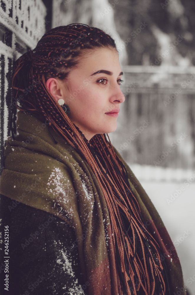stylish portrait of an attractive woman with long pigtails, dressed in an eco-coat and scarf, walked in a winter-frozen city