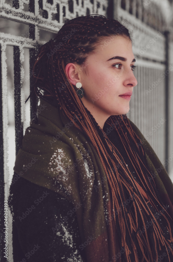 stylish portrait of an attractive woman with long pigtails, dressed in an eco-coat and scarf, walked in a winter-frozen city