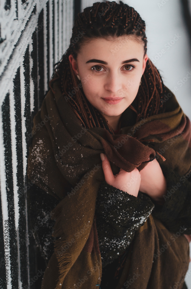 stylish portrait of an attractive woman with long pigtails, dressed in an eco-coat and scarf, walked in a winter-frozen city
