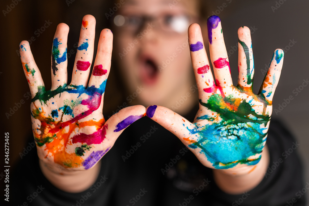 A child looks happy or surprised as her hands are covered in red, pink, yellow, orange, red, blue, green, and purple ink. Concepts: art, education, play, watercolor, joy, mess, creativity, fun, enjo