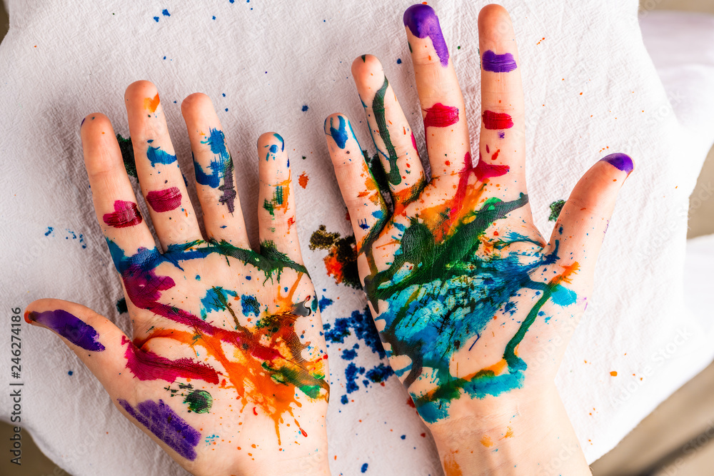A child's hands are covered in red, pink, yellow, orange, red, blue, green, and purple ink. Concepts: art, education, play, watercolor, finger painting, mess, creativity, fun, enjoyment