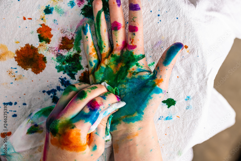 A child cleans up hands that are covered in red, pink, yellow, orange, red, blue, green, and purple ink. Concepts: art, education, play, watercolor, finger painting, mess, creativity, fun, enjoyment