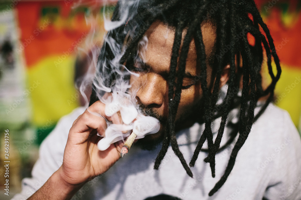 Portrait of smoking man with cigarette. Mixed race black skin and dreadlocks hairstyle
