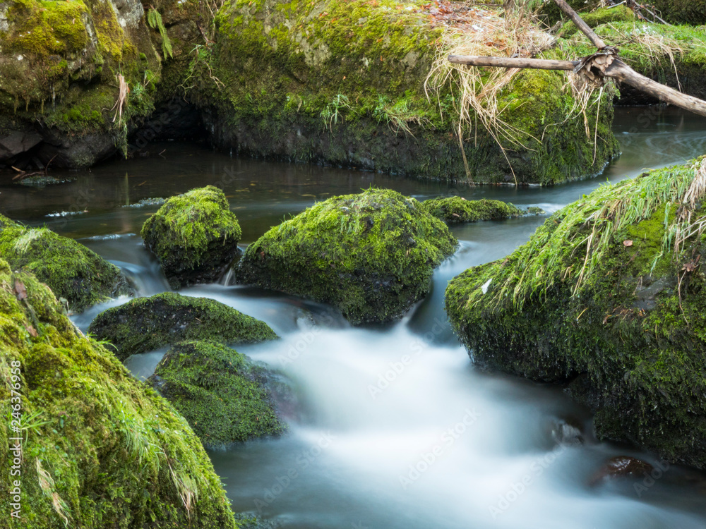 smooth motion of wild water in a river in winter with snow and ice on rocks and stones in the beautiful nature of a forest