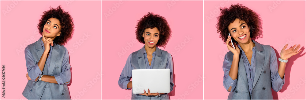 collage of young african american businesswoman thinking, using laptop and talking on smartphone on pink background