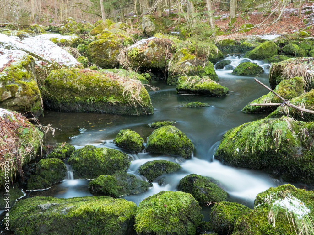 smooth motion of wild water in a river in winter with snow and ice on rocks and stones in the beautiful nature of a forest