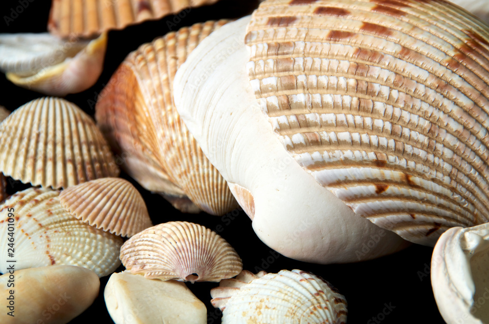 Collection of ribbed clam type sea shells on black background.