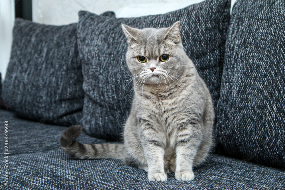 The cute british cat on the sofa, looking a bit sceptical and nervous, as it has crooked mouth.