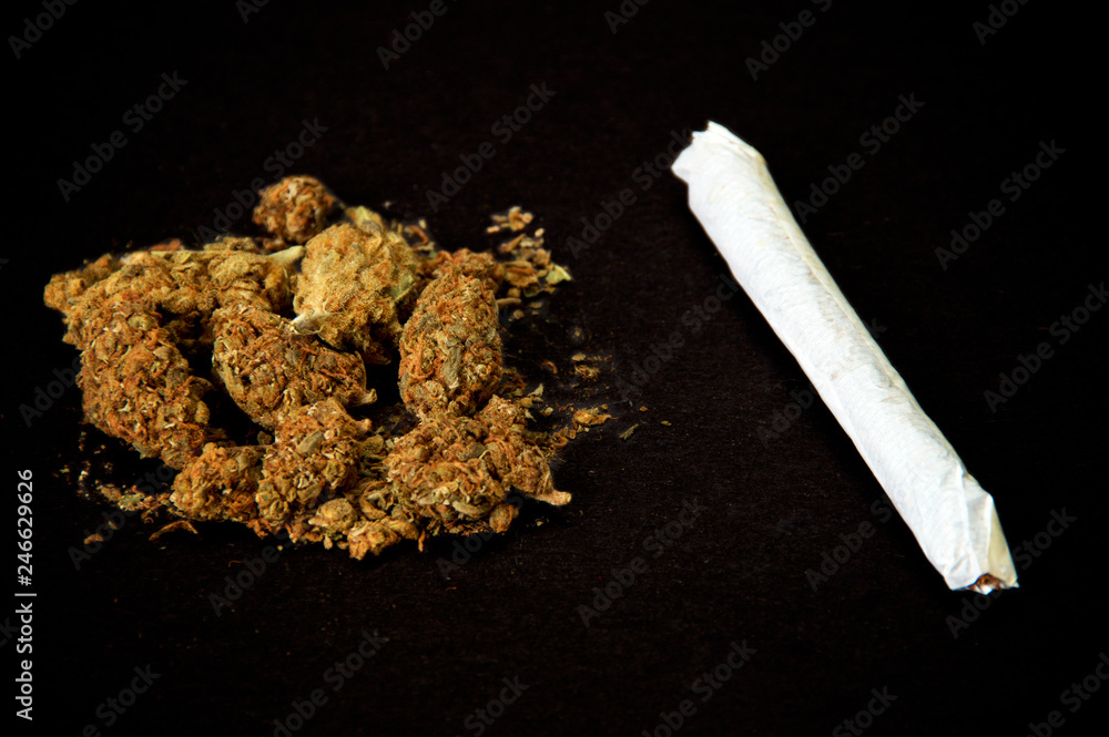pile of buds of cannabis and marijuana cigarette on black background. Used as a recreational drug and also alternative medicine.