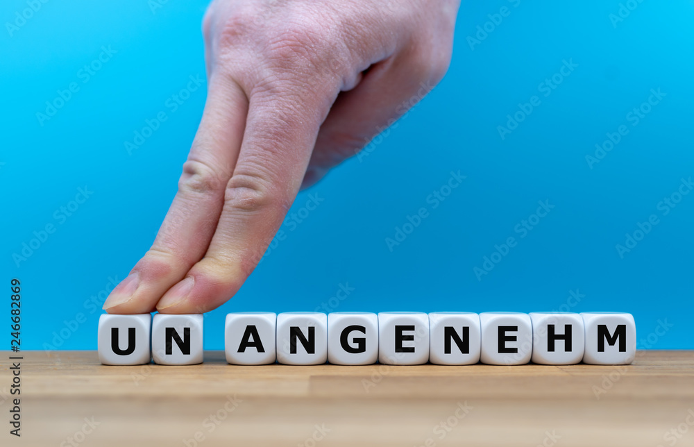 Zwei Finger schieben die Würfel mit den Buchstaben U und N zur Seite und verändern das aus Würfeln geformte Wort "UNANGENEHM" in "ANGENEHM".