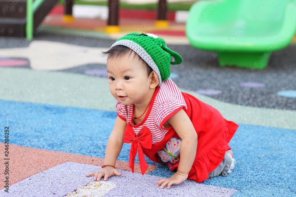 A baby child girl crawling on a flexible floor at the playground.