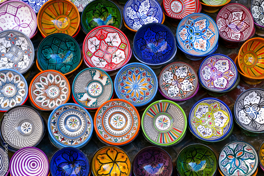 Essaouira, Morocco - October 1, 2018: Moroccan pottery in Essaouira. Colorful ceramics and pottery displayed outside a shop. Beautiful oriental design with plenty of colors.