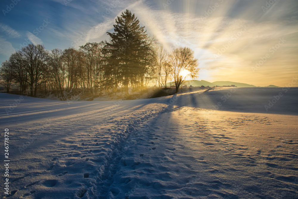 Beautiful winter sunset with trees in the snow