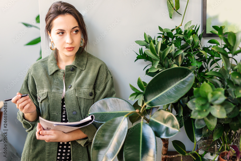 Woman stand at office surround with green plants and write at her note book