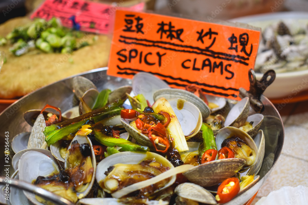 Hot pot with spicy clams sold on a street market in Hong Kong China