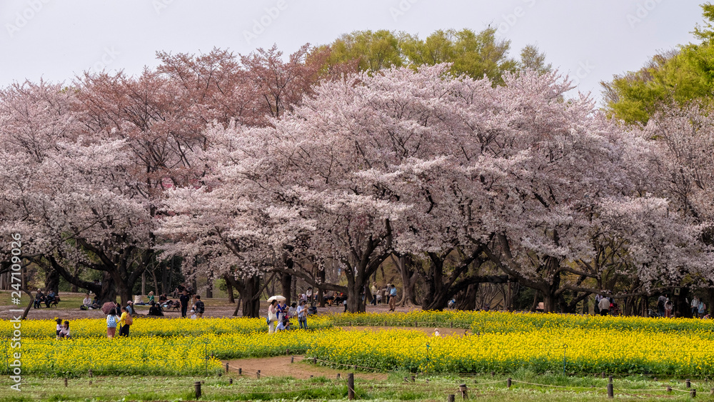 Tokyo, Japan - April 1 : the unidentified people go to picnic and relax under cherry blossom trees at Showa Kinen Koen park on April 1, 2018 in Tokyo, Japan.
