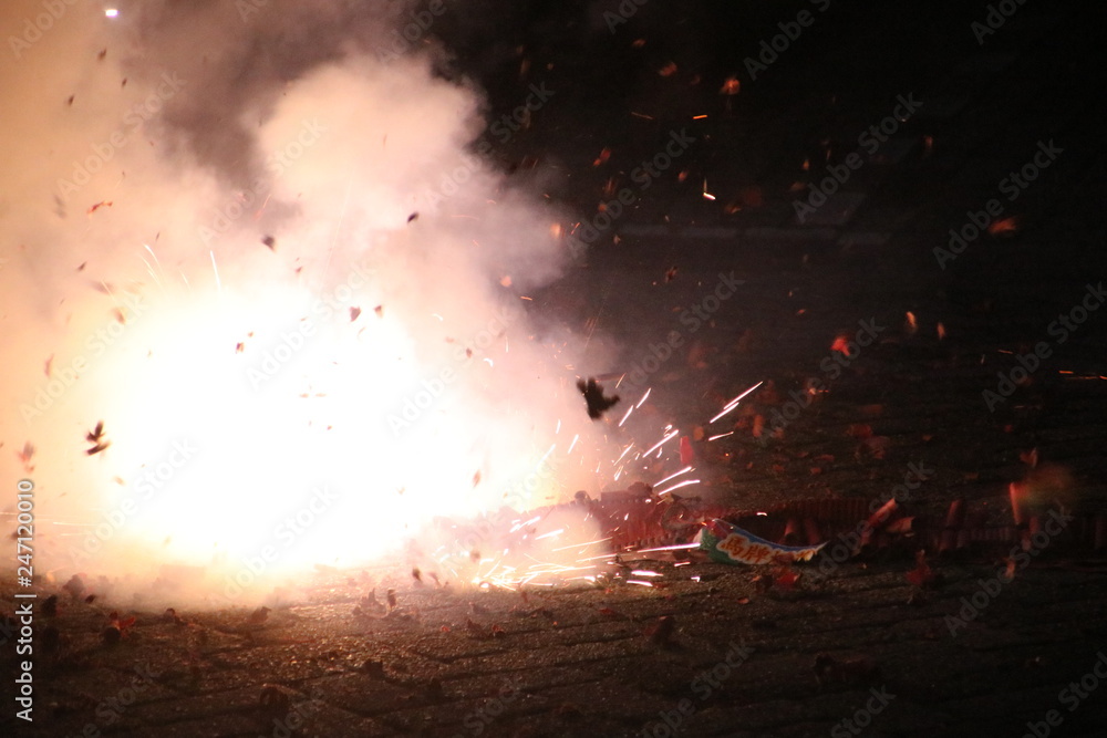 loud chinese crackers in a row are exploding during New Years Eve in the Netherlands where this kind of fireworks are illegal