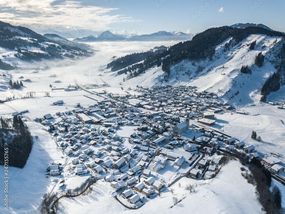 Aerial view of snow covered town in Switzerland. Rothenthurm village in winter.