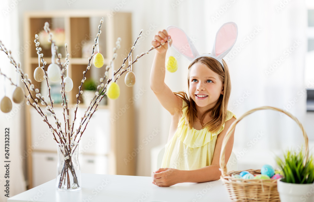 easter, holidays and people concept - happy girl wearing bunny ears headband decorating willow branches by toy eggs at home