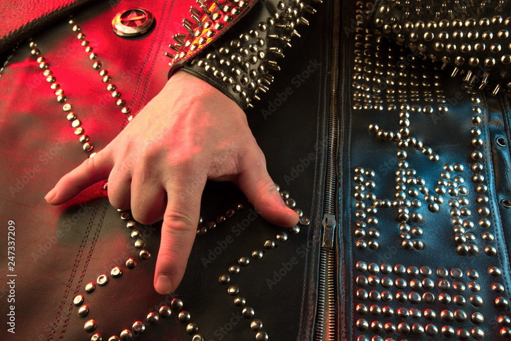 Hand of rocker in leather bracelet.Rock & roll, heavy metal,gothic,punk,horns sign and fist.Hard style.Rivets accessories