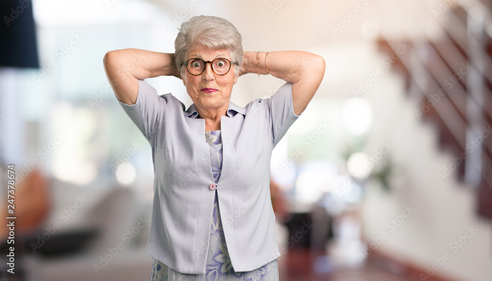 Beautiful senior woman crazy and desperate, screaming out of control, funny lunatic expressing freedom and wild at home.